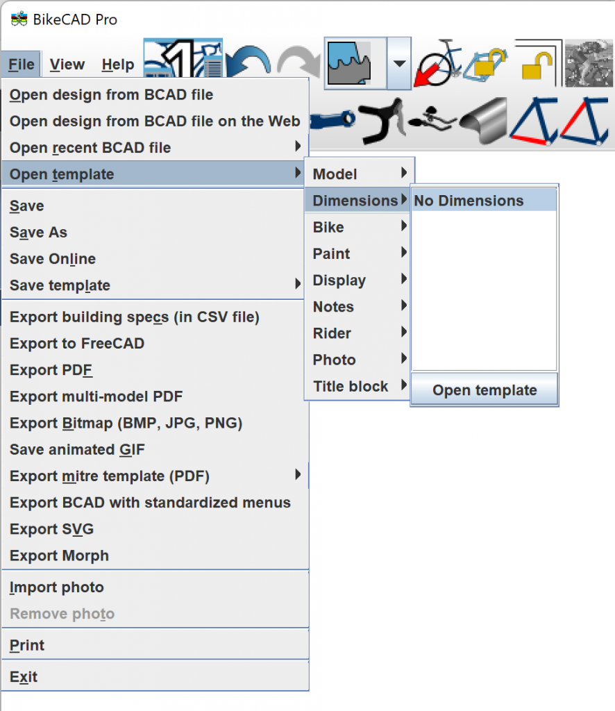 I'm not sure, but I wonder if you are getting confused by the default state of a new copy of BikeCAD. When you initially install BikeCAD, the only Dimension template that will exist is called "No Dimensions". The purpose of opening this template would be to clear all the dimensions on the screen (by displaying "no dimensions"). In order to display various other sets of dimensions, you must first save them as described here. If you are following these instructions but things aren't working as expected, please let me know at what point you're getting an unexpected result.