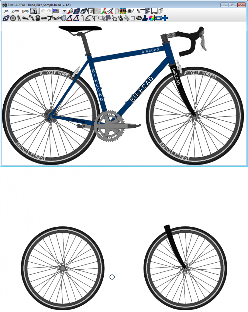 I can't be sure when I'll have the new non-Java applet based free version of BikeCAD ready. However, here's a screen capture of a sample bike in BikeCAD, and below it, that same sample bike in the non-Java applet based version of BikeCAD. As you can see, there are still a few things missing in the new free version, but things are coming along.
