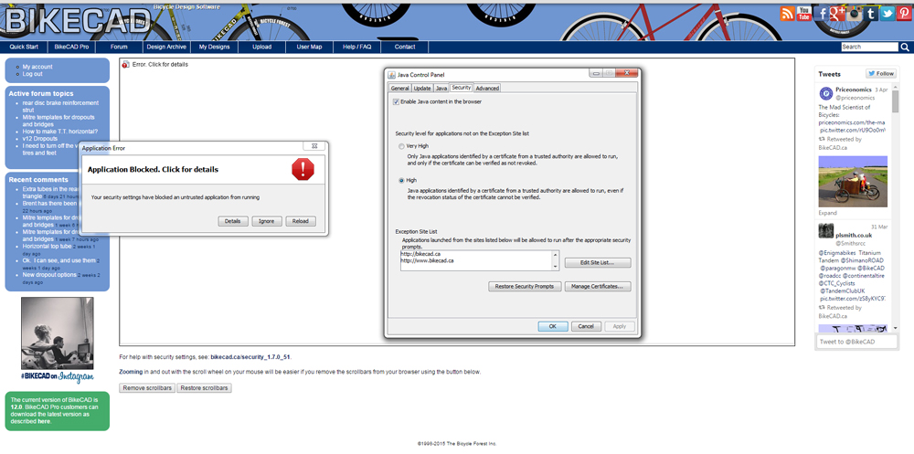 I've added it to the exception list, both, http://bikecad.ca and http://www.bikecad.ca and stil get a message that the application's been blocked because of my security settings...