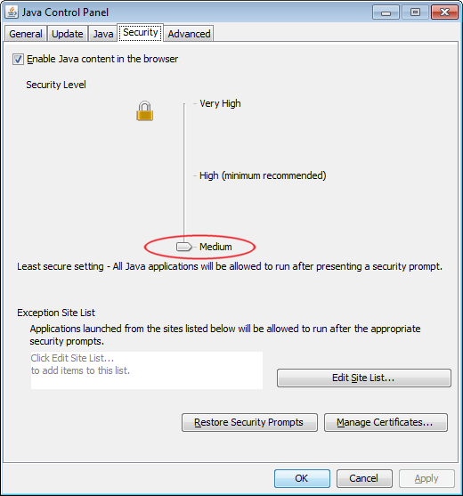 The first approach is to navigate to the security tab in the Java control panel and lower the security level to medium.
