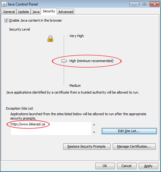 i have add both https://www.bikecad.ca and https://bikecad.ca to the exception list and still will not work. java sends an error message that the applet doesnt doesnt meet the security settings that i have set. i dont understand what is happening. running IE.