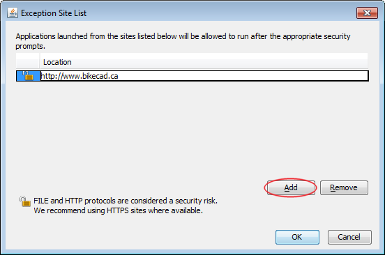 I've added it to the exception list, both, http://bikecad.ca and http://www.bikecad.ca and stil get a message that the application's been blocked because of my security settings...