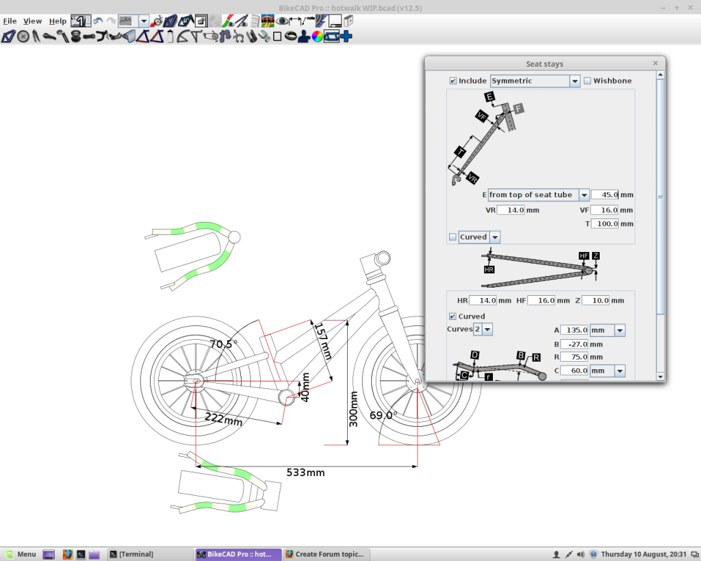 Dimension F is the distance from the end of the seat stay to the centerline of the seat tube measured perpendicular to the seat tube. Describing it in words like this is cumbersome. I'd rather just show the dimension in a diagram as you see above. BikeCAD does not however allow you to input this value. Instead this dimension is driven by dimension Z. Notice how dimension F changes when Z is made larger or smaller.