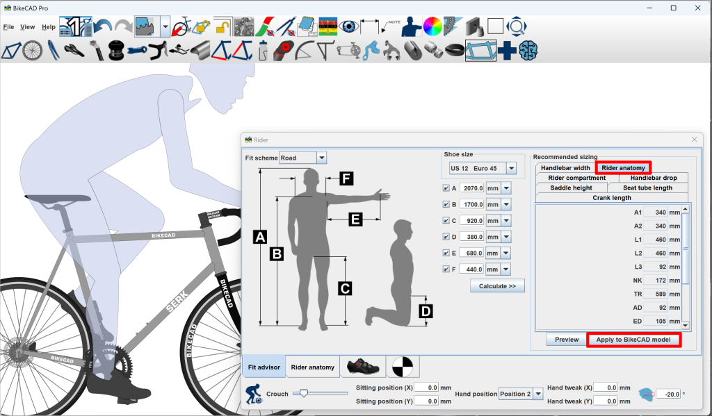 I just transferred your body geometry numbers into my own model and below is the image that I get. I believe the key here is to click the Rider Anatomy tab and then the Apply to BikeCAD model button. The model of the rider won't update until this button is clicked.