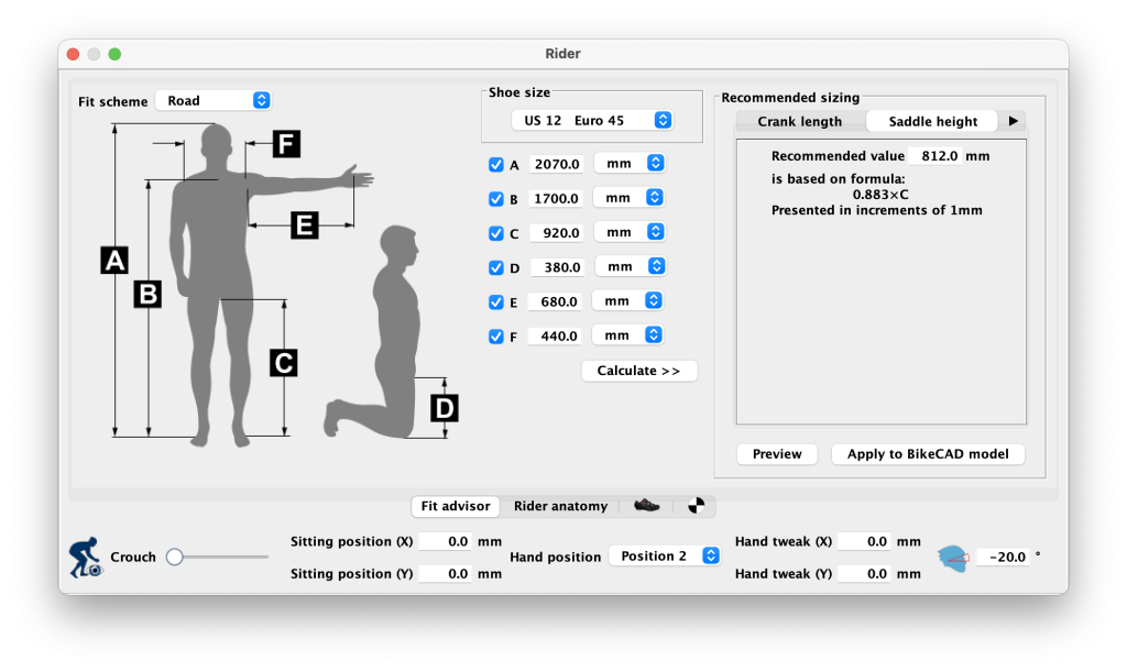 I've been playing around with the fit advisor for a very tall rider. His inseam is 920mm. Recommended seat height is 812mm based on the 0.883 formula. When rider is displayed on the bike with the crank inline with the seat tube the leg is disconnected (i'm guessing leg in the model is somehow too short and this results in disconnection). Also the leg is locked out with a knee angle of 180 degrees. Am I missing something here?