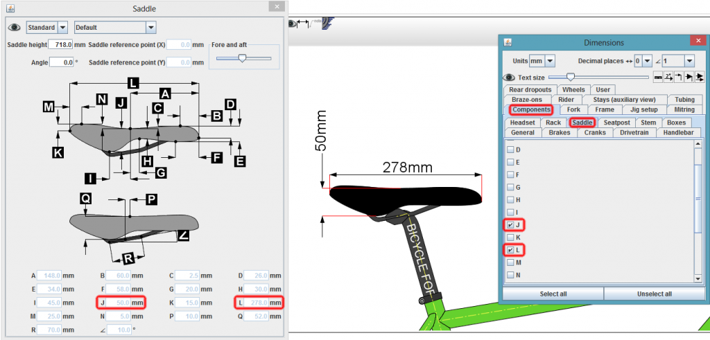 The length of the saddle is 278mm. You can easily obtain this information for any saddle. If you open the Saddle dialog box, you will see that the length (L) is one of the input values. You can also show this dimension using the Dimensions dialog box. Meanwhile, the width is not explicity stated. The default saddle could be used to represent a variety of saddles of different widths. If you are storing a selection of specific saddle models in BikeCAD Pro, I would recommend incorporating the width dimension into the name of the saddle when saving it to your database.