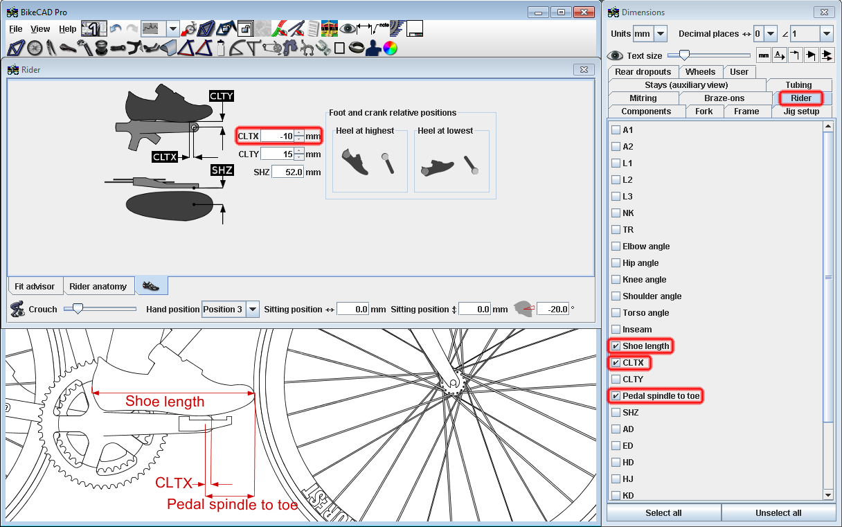 CLTX refers to the horizontal displacement of the cleat relative to a point that is roughly the neutral position for the cleat. However, be aware that there is no universal standard for locating the neutral position of the cleat. Do not assume that if you set your cleat to the middle of its range of adjustment, that this equates to a CLTX dimension of 0mm. Although that was the idea, there is just too much variation in shoe design to assume this is always the case. The best way to ensure accurate representation of cleat position is to display the Pedal spindle to toe dimension along with the Shoe length dimension. Make sure that you've selected the shoe size that most accurately represents your actual shoe length. Even though your actual shoe might be a size 42.5, it's possible that that might be best represented in BikeCAD by some slightly different size. Next, measure your actual pedal spindle to toe dimension and then tweak CLTX until the Pedal spindle to toe measurement in BikeCAD agrees with your own measurement.