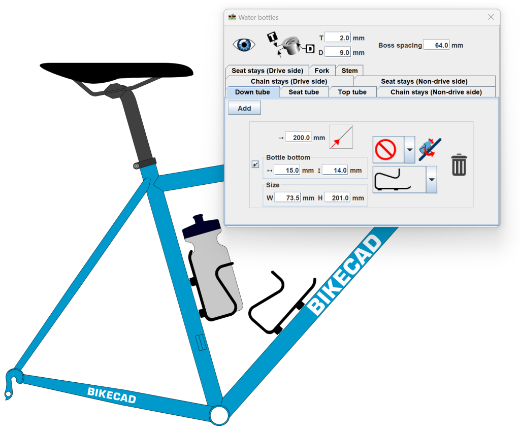 Mault By Mault | 8:17 PM EDT, Wed September 20, 2023 Forums BikeCAD Feature Request Currently the cage and bottle must be displayed together. Show cage without bottle Thanks for the suggestion. I've just added this to the next update: Log in or register to post comments Log in or register to post comments