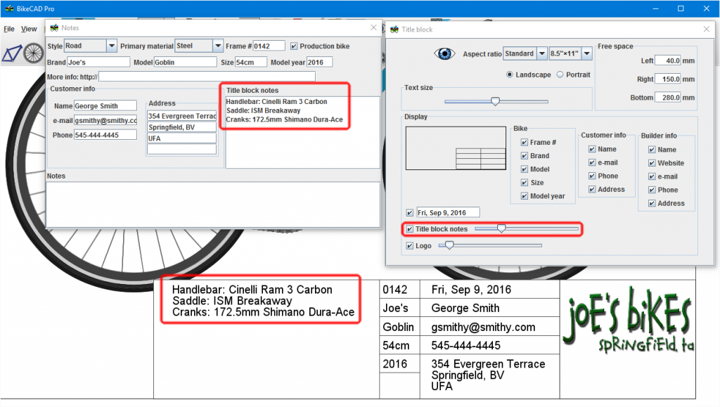 Thanks for letting me know of your interest in this. Others have proposed this as well, so I should plan to add this to a future update. In BikeCAD version 12.0, I added the option to display frame number, brand, model, size and model year to the title block. However, in the future, when I add more fields to the title block, I don't think I ought to attempt to pick out certain ones to add, as I did in version 12.0, but rather come up with a mechanism whereby a builder could choose to display any of the specifications already defined within BikeCAD. I could maybe do this by adding a column of checkboxes in the interface used to select which dimensions are output in the CSV file. In the meantime, I trust people are aware that they can display any extra details they like in the title block as I've illustrated below. The thing that is currently lacking is the ability to pull this information from where it is already specified within the BikeCAD model.