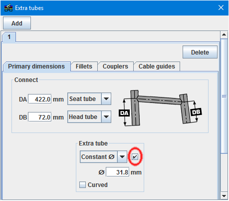 You can toggle on and off the display of extra tubes using the checkbox I've highlighted below. While it may not be obvious that this checkbox is the one that controls tube visibility, down tubes and top tubes can also be controlled with similar checkboxes. For more on extra tubes, see: bikecad.ca/extra_tubes